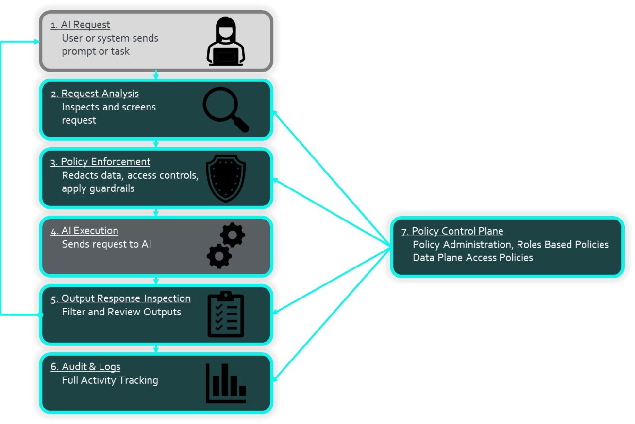 Replace fragmented point solutions with a single platform that secures and monitors every AI interaction.